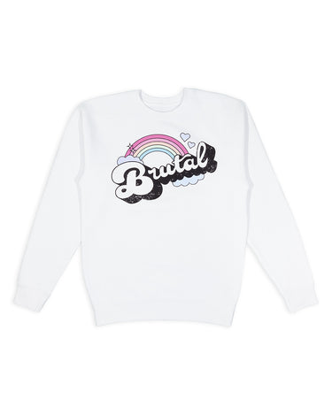 Crafted with thick, heavy-weight fabric, this white oversized crewneck features the word "Brutal" in bubbly, distressed letters accented by a vibrant rainbow and hearts.