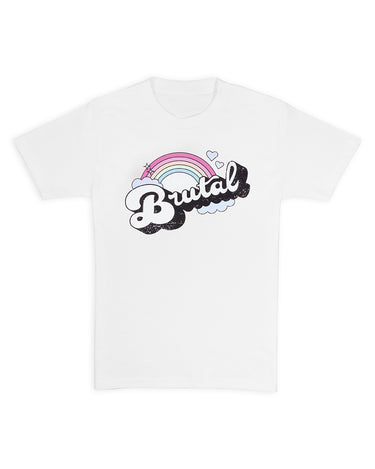Where tough meets tender. This white true-to-size t-shirt features the word "Brutal" in bubbly, distressed letters adorned with a rainbow and hearts, giving it a playful, vintage vibe.