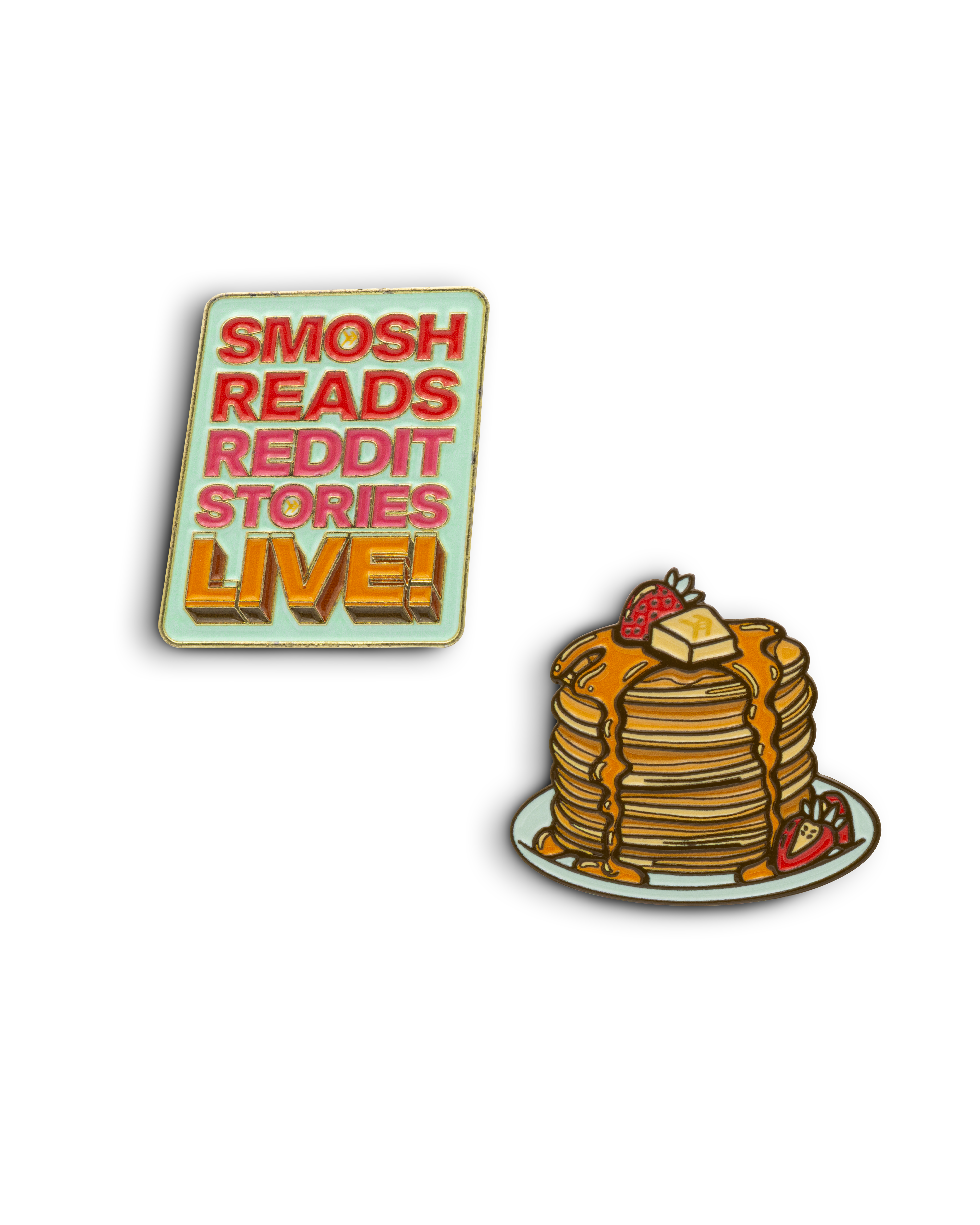 This pin pack includes 2 enamel pins, one is the Smosh Reads Reddit Stories Live! logo, and the other is a stack of pancakes, obviously!
